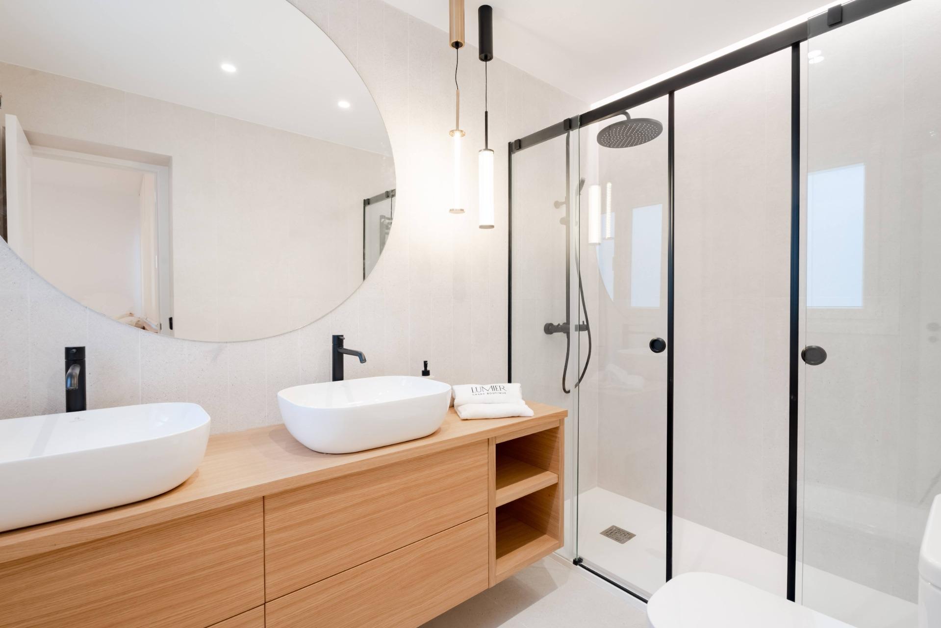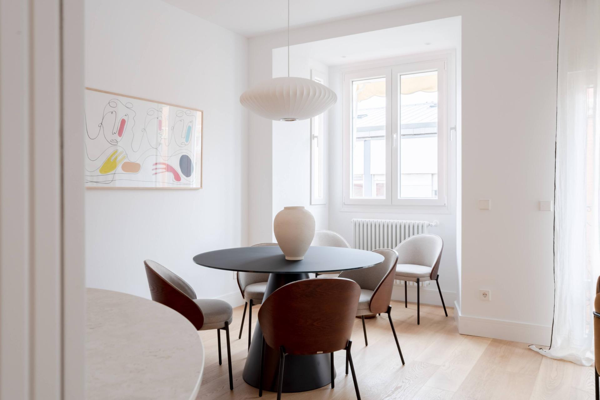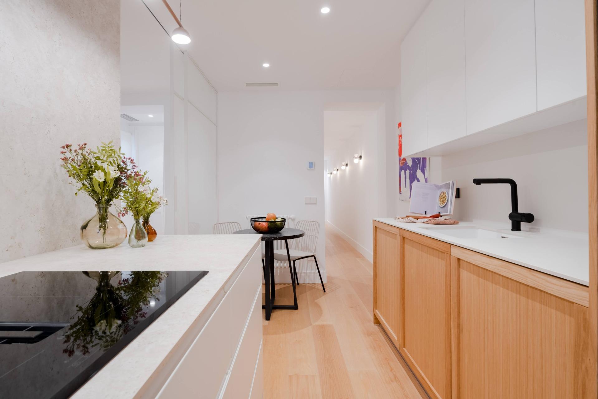 Tiene suelo de tarima natural de roble, ventanas Komerling con persianas eléctricas, cerámicas de Porcelanosa con grifería Noken, cocina de diseño hecha a medida con electrodomésticos Siemens ( lavadora, secadora, nevera, microondas, horno, vinoteca y placa vitrocerámica con campana).