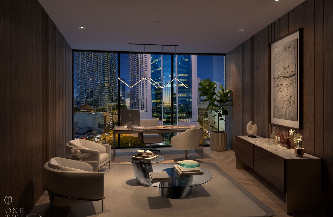 One Twenty Brickell Residences crea el balance perfecto entre el lujo moderno, la comodidad y la funcionalidad en el epicentro financiero de Miami. Las vistas desde 120 Brickell’s Residences son simplemente impresionantes. Incluyen las áreas del centro de Miami y Brickell, el río Miami y el océano Atlántico. Único en One Twenty Brickell Residences es su colección de suites de oficina exclusivas, primeras en su tipo, cedidas individualmente a los residentes al comprar una unidad de condominio. Cada oficina privada con paneles de vidrio cuenta con una variedad de características para que el trabajo sea cómodo para los residentes.